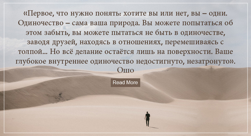 Одинокость может быть невероятно жуткой, как будто чего-то или кого-то не хватает. Одиночество проживается совсем наоборот – нет недостатка ни в чём и ни в ком, мы полны. Одинокость – это негативное состояние ума. Одиночество положительно. Как нам перебраться из одного в другое? |